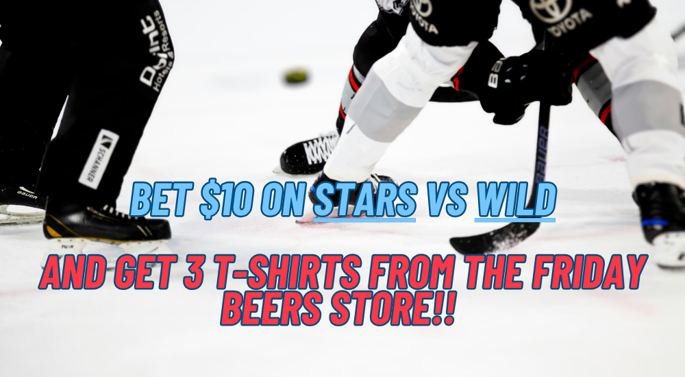 Place a $10 bet on Stars VS Wild & GET 3 T-Shirts From The Friday Beers Store! (AN ACTUAL BET MUST BE PLACED TO RECEIVE YOUR T-SHIRTS)