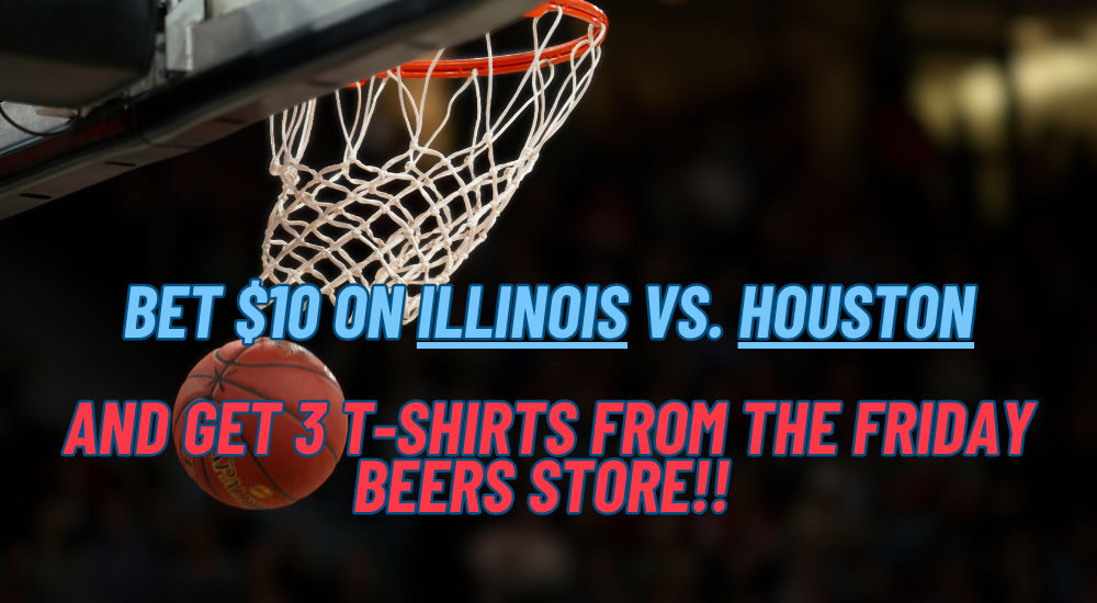 Place a $10 bet on Illinois VS Houston & GET 3 T-Shirts From The Friday Beers Store!(AN ACTUAL BET MUST BE PLACED TO RECEIVE YOUR T-SHIRTS)
