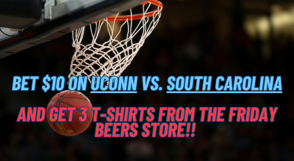 Place a $10 bet on UConn VS South Carolina & GET 3 T-Shirts From The Friday Beers Store!(AN ACTUAL BET MUST BE PLACED TO RECEIVE YOUR T-SHIRTS)