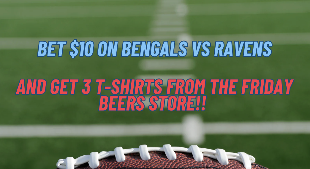 Place a $10 bet on Bengals vs Ravens & GET 3 T-Shirts From The Friday Beers Store! (AN ACTUAL BET MUST BE PLACED TO RECEIVE YOUR T-SHIRTS)