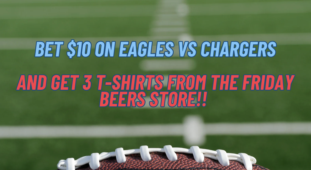Place a $10 bet on Eagles vs Chargers & GET 3 T-Shirts From The Friday Beers Store! (AN ACTUAL BET MUST BE PLACED TO RECEIVE YOUR T-SHIRTS)