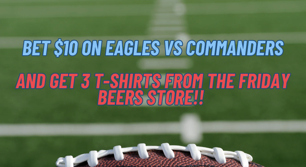 Place a $10 bet on Eagles vs Commanders & GET 3 T-Shirts From The Friday Beers Store! (AN ACTUAL BET MUST BE PLACED TO RECEIVE YOUR T-SHIRTS)
