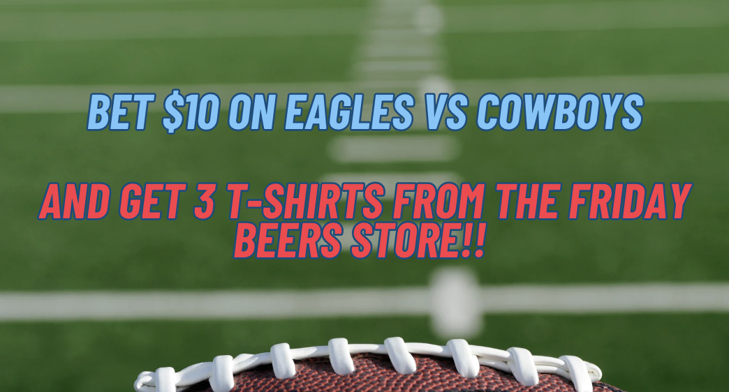 Place a $10 bet on Eagles vs Cowboys & GET 3 T-Shirts From The Friday Beers Store! (AN ACTUAL BET MUST BE PLACED TO RECEIVE YOUR T-SHIRTS)