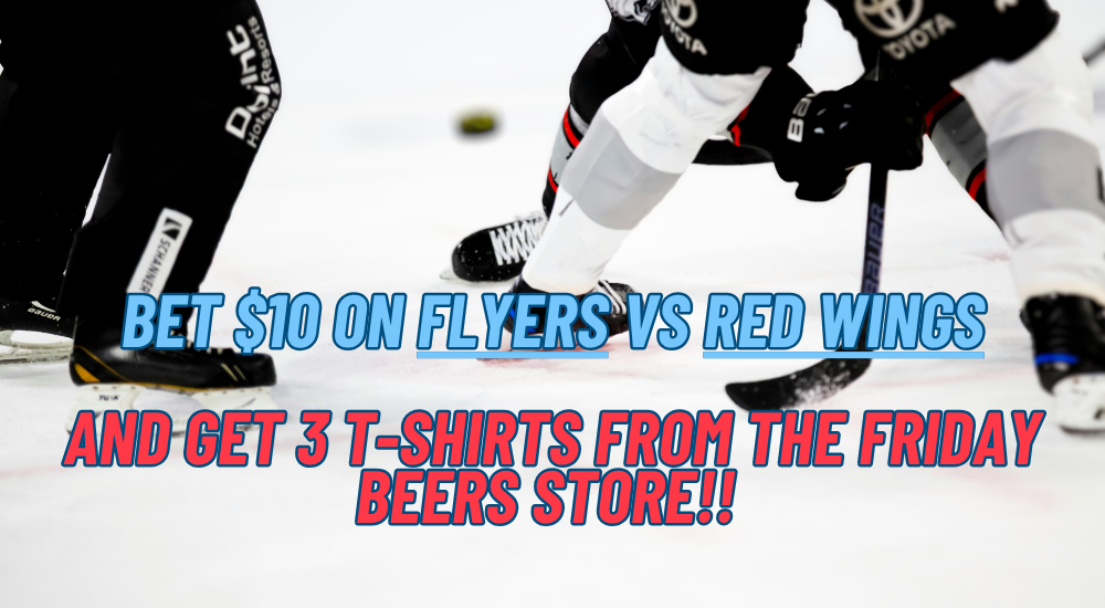 Place a $10 bet on Flyers VS Red Wings & GET 3 T-Shirts From The Friday Beers Store!(AN ACTUAL BET MUST BE PLACED TO RECEIVE YOUR T-SHIRTS)