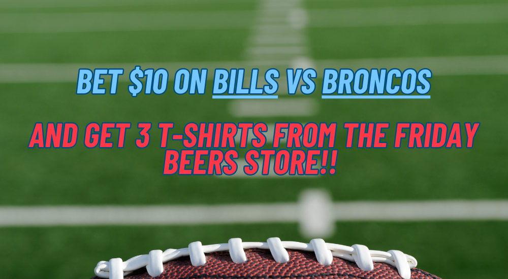 Place a $10 bet on Bills VS Broncos & GET 3 T-Shirts From The Friday Beers Store! (AN ACTUAL BET MUST BE PLACED TO RECEIVE YOUR T-SHIRTS)