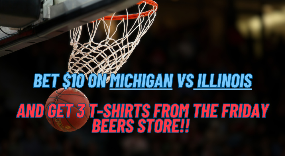 Place a $10 bet on Michigan VS Illinois & GET 3 T-Shirts From The Friday Beers Store! (AN ACTUAL BET MUST BE PLACED TO RECEIVE YOUR T-SHIRTS)