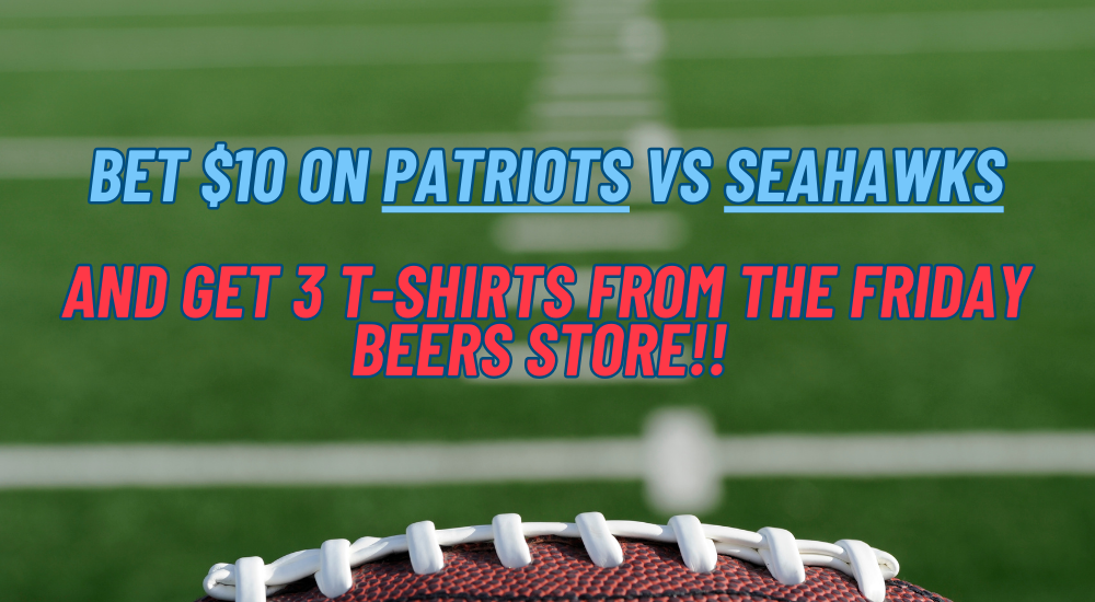 Place a $10 bet on Patriots VS Seahawks & GET 3 T-Shirts From The Friday Beers Store! (AN ACTUAL BET MUST BE PLACED TO RECEIVE YOUR T-SHIRTS)